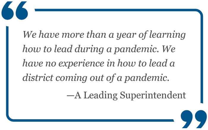 These types of challenges are coming our way. A leading superintendent warns, “We have more than a year of learning how to lead during a pandemic. We have no experience in how to lead a district coming out of a pandemic.” The year ahead will be unlike any other. Addressing new, unprecedented challenges will require flexibility and creativity from the field.